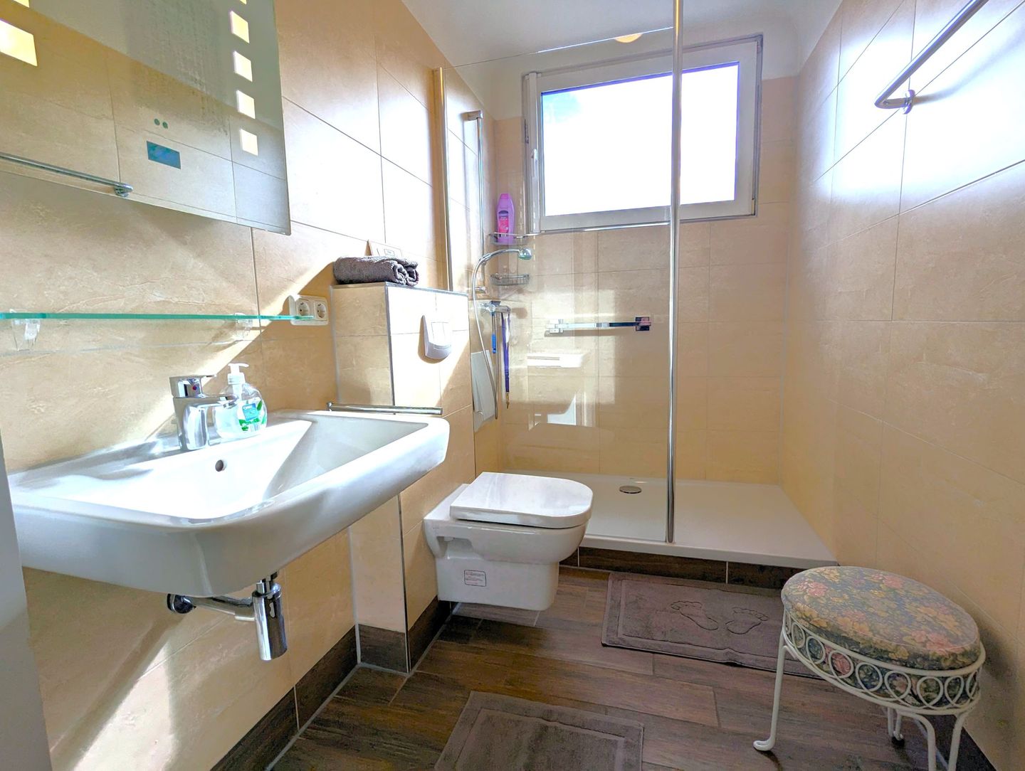 Das hochwertige Badezimmer mit WC und großer Dusche ist stilvoll und gleichermaßen zweckmäßig.